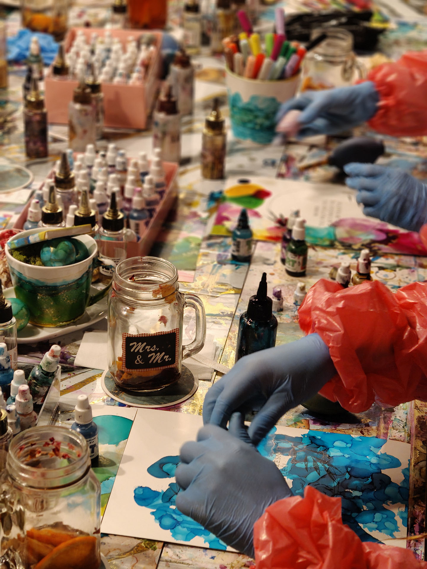 INK-ART™ to autorska metoda pracy z tuszami alkoholowymi i powietrzem. Zamiast tradycyjnych pędzli wykorzystywane są specjalne pompeczki, które wprawiają tusz w ruch i pozwalają prowadzić go po podłożu w nieprzewidywalny, a zarazem intuicyjny sposób. Proces tworzenia opiera się tu na swobodnym działaniu, kontakcie z kolorem i obserwowaniu reakcji materiału, bez presji osiągnięcia z góry założonego efektu.