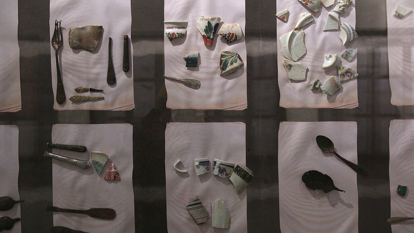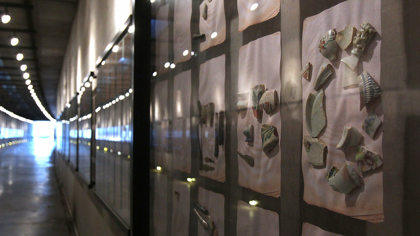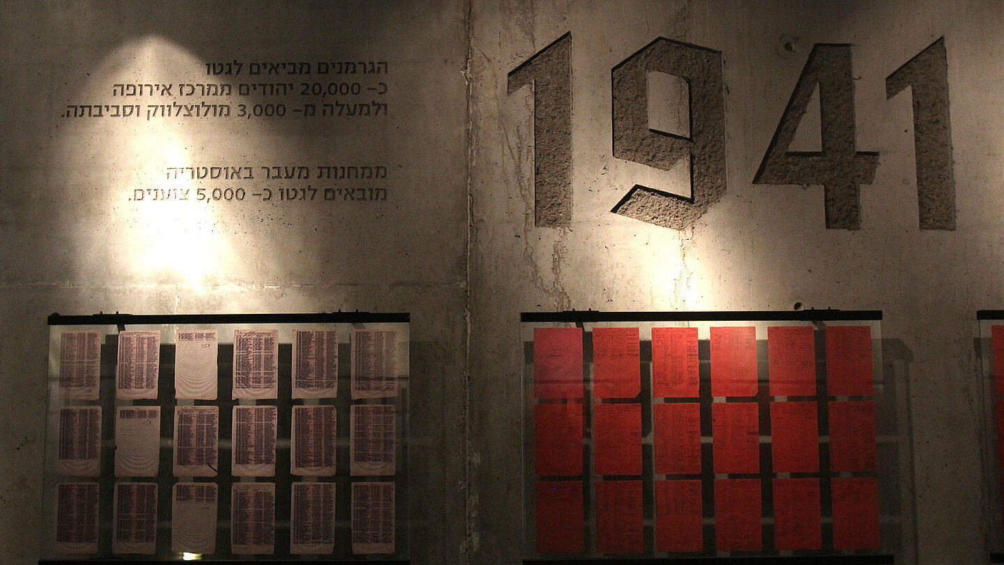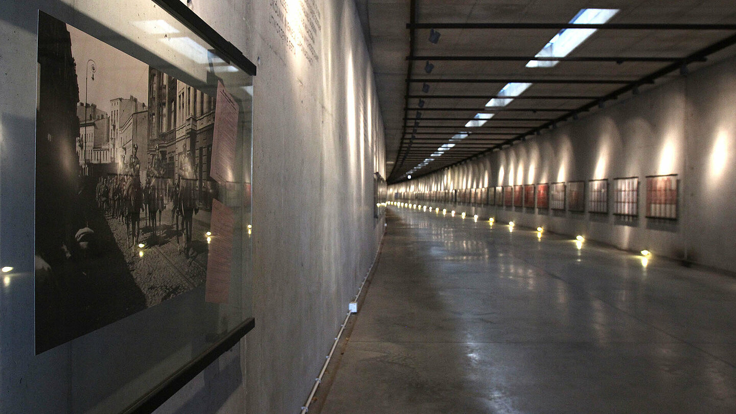 Na ekspozycji w budynku stacyjnym znajduje się makieta getta łódzkiego. Jest to największa tego typu makieta w Polsce, przedstawiająca wygląd dzielnicy zamkniętej w 1942 roku w skali 1:400. Szczegółowość makiety oraz niezwykle profesjonalne wykonanie pozwalają śledzić główne ciągi komunikacyjne, małą infrastrukturę czy dostrzec detale wielu istniejących i nieistniejących już budynków. Oprócz makiety prezentowane są wszystkie zachowane listy transportowe w postaci aplikacji multimedialnej oraz eksponaty z kolekcji własne Muzeum lub innych instytucji. Największym elementem Pomnika jest Tunel Deportowanych, w którym znajdują się wybrane listy transportowe ułożone chronologicznie oraz przedmioty z obozu zagłady w Chełmnie nad Nerem. Na końcu Tunelu znajduję się Kolumna Pamięci, z napisem Nie zabijaj w języku niemieckim, hebrajskim i polskim, wewnątrz wykutymi na ścianach nazwami wszystkich miast, z których przewieziono Żydów do getta łódzkiego.