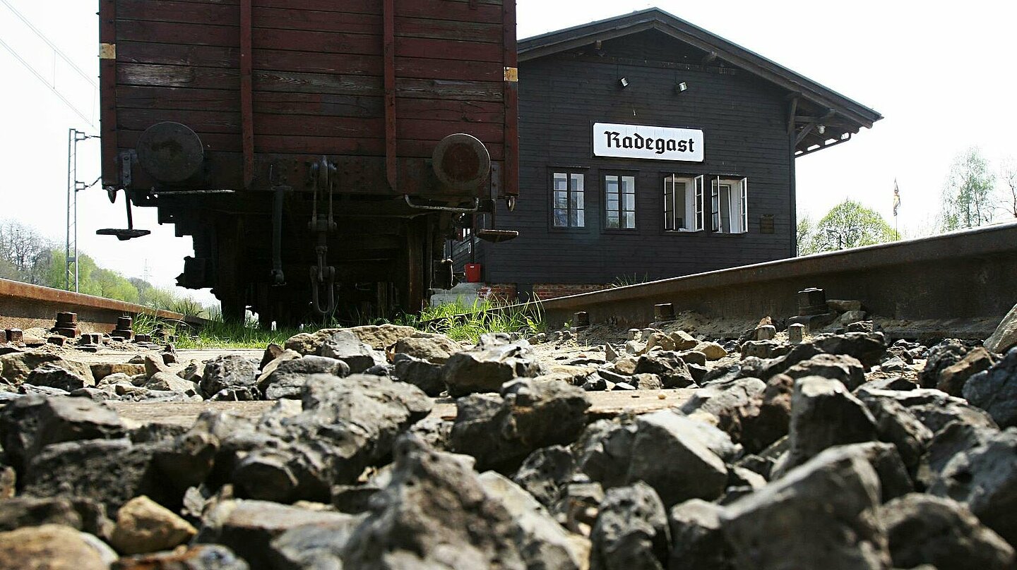 Budynek drewniany Stacji Radegast jest zabytkowym budynkiem kolejowym z 1941 r. W czasie II wojny światowej była ona związana z gettem, utworzonym przez Niemców w 1940 r. w Łodzi (Litzmannstadt). Początkowo obiekt pełnił funkcję punktu przeładunkowego żywności i surowców, przeznaczonych dla ludności i zakładów pracy getta. Od stycznia 1942 r. Stacja stała się miejscem, z którego wywożono ludność żydowską do obozów zagłady Kulmhof w Chełmnie nad Nerem i Auschwitz-Birkenau. Szacuje się że przez teren Stacji przeszło ok. 145 tys. Żydów. Dziś budynek ten jest miejscem pamięci, elementem Pomnika Zagłady Litzmannstadt Getto, powstałym w 2004 r. oraz siedzibą oddziału Muzeum Tradycji Niepodległościowych w Łodzi.