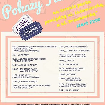 PROGRAM: Sekretne życie Waltera Mitty– 20.07 – godz. 21:00 Kingsajz – 21.07 – godz. 21:00 Czarny Łabędź – 27.07 - godz. 21:00 Maria Skłodowska-Curie / pokaz shortów– 28.07 – godz. 21:00 Przepis na Mił więcej